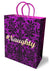 Unlike other gift bags, youb ll be proud to wrap your naughty gifts in these playfully suggestive bags. They look expensive and feel amazing! High quality, unique luxury gift bags made of thick, sturdy cardstock paper with elegant woven handles. This purple 10-inch gift bag with black velvet-like flocked fleur-de-lis pattern has an imprinted gold foil stamp b #Naughtyb . This delightful bag is as fun to give as it is to receive.