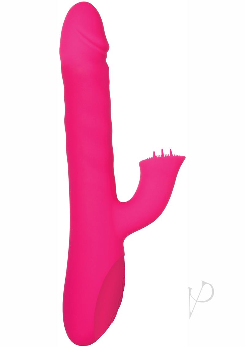 Go over the edge into ecstasy with this rabbit's dizzying combination of rotation, thrusting, and clit-tastic vibration! Crafted from creamy-smooth silicone, the tip of its shaft delivers half an inch of thrust while it also rotates for the deepest pleasure. Rotating beads under the shaft's head add to the stimulating inner massage. Feel the rush as the 10-function vibrating clitoral stimulator's 200 tiny nubs and 3 tongue-like ticklers flicker against your hot button. Rechargeable, waterproof, and fully submersible too. Clean with Adam & Eve Toy Cleaner and a warm water rinse.